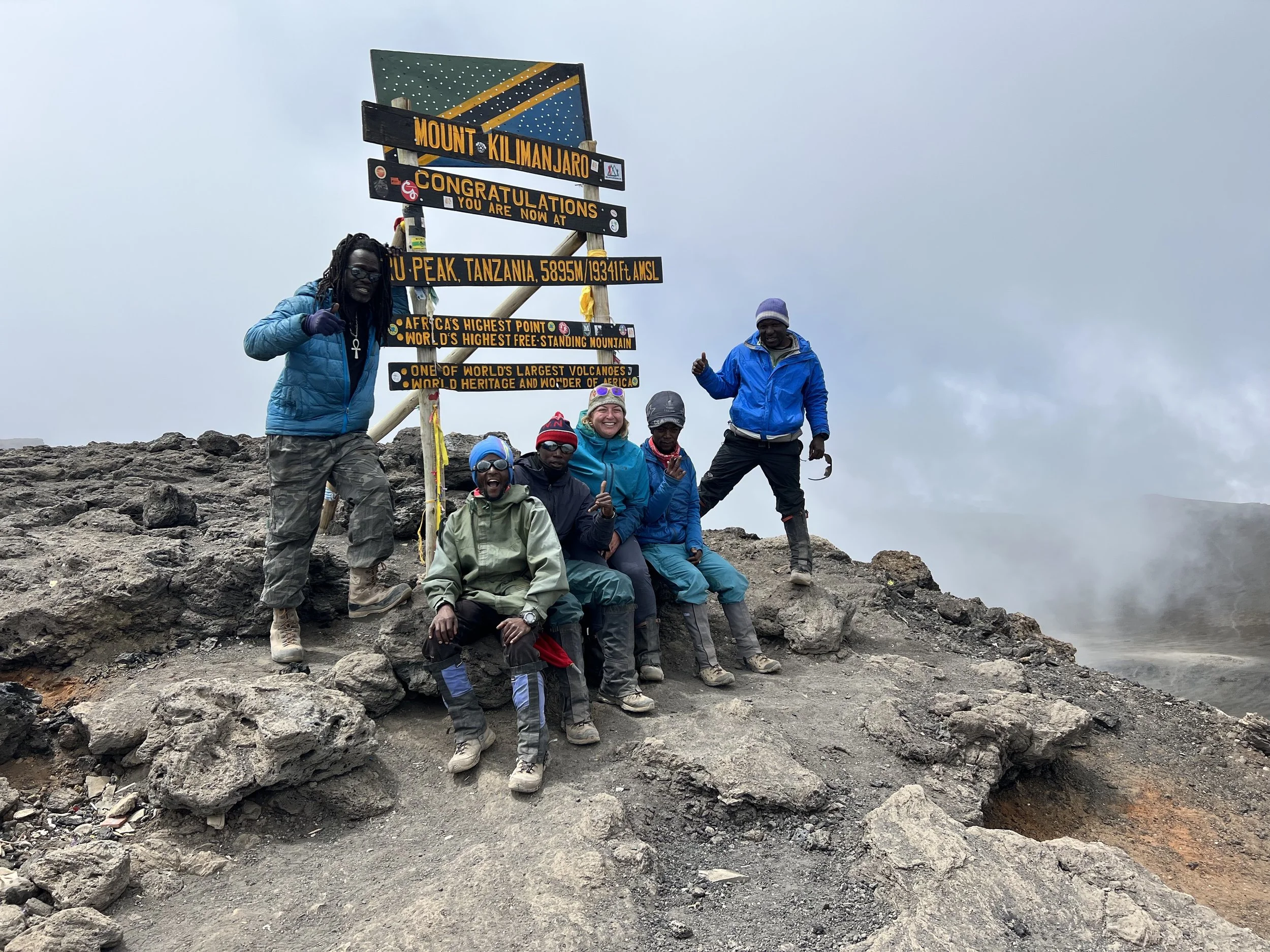 Me sitting at the roof of Africa, Uhuru Peak with our 3 of our guides, our medic and one of our many porters.