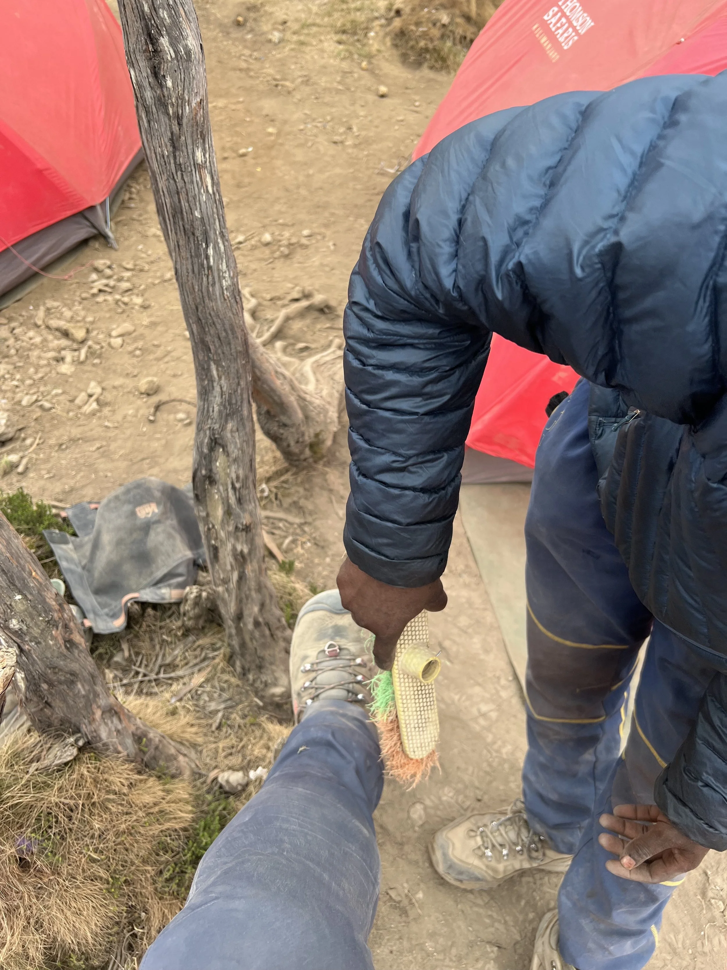 This is Hassan and the story of my boots. Hassan is a porter and he carried my 33 pound duffel bag up and down Mount Kilimanjaro for nine days. He welcomed me at the end of every day‘s hike to carry my day pack for the last stretch into camp. He showed me to my tent that he likely set up and never once forgot his smile, no matter if it was first thing in the morning or at the end of a long day’s trek. Every afternoon when we would arrive at my tent, he would insist on brushing off my boots and gators, removing them and making sure I was OK by way of a thumbs up or fist bump. Hassan didn’t speak much English but we had clear and wonderful communication. He is now one of my brothers and a member of my previously introduced sacred family, familia takatifu.